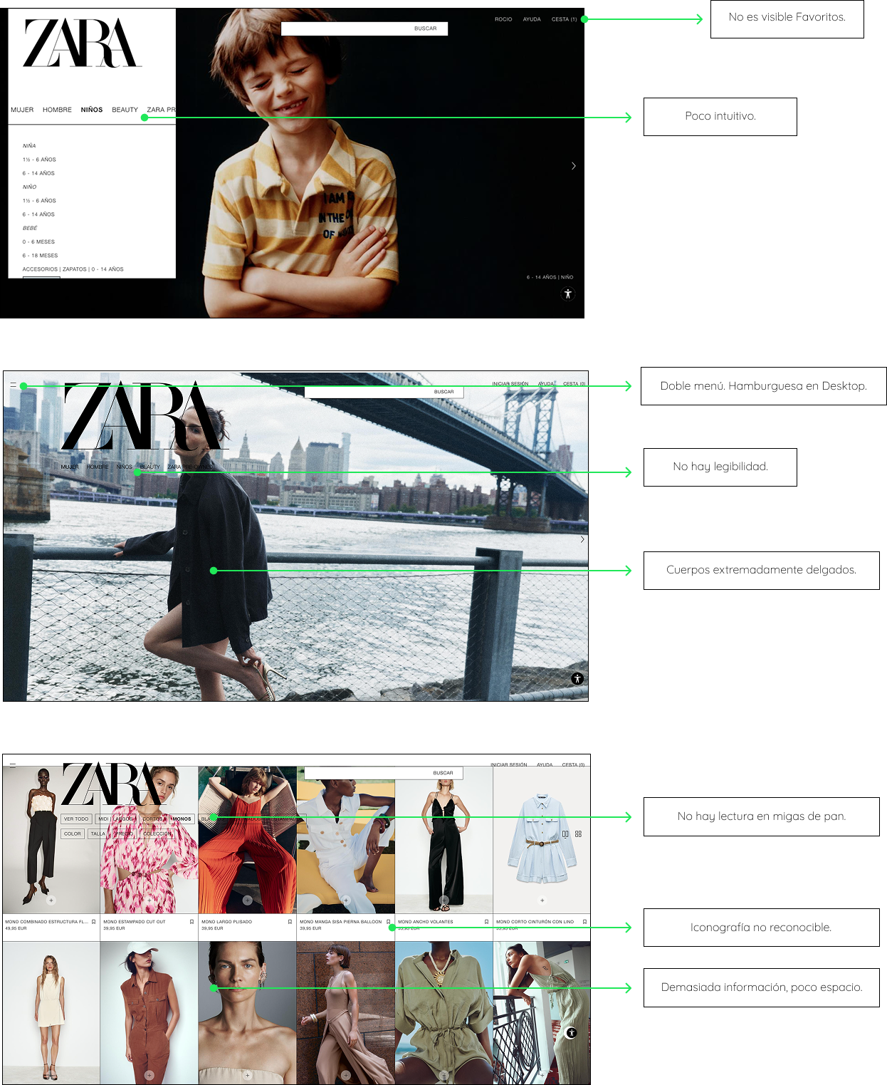 El diseño de toda la web no está centrado en el usuario, sino en la estética de la marca. Al priorizar la imágen por sobre la usabilidad, dificulta la experiencia del usuario. Genera un esfuerzo de parte del usuario para poder realizar la compra. La plataforma en línea de Zara, presente en 49 mercados distintos en todo el mundo, recibe 2,5 millones de usuarios únicos al día, y más de 30 millones al mes. Durante el Black Friday de 2017, Zara alcanzó su récord de ventas en línea con 249.216 pedidos en solo una hora.